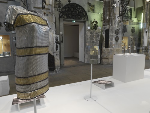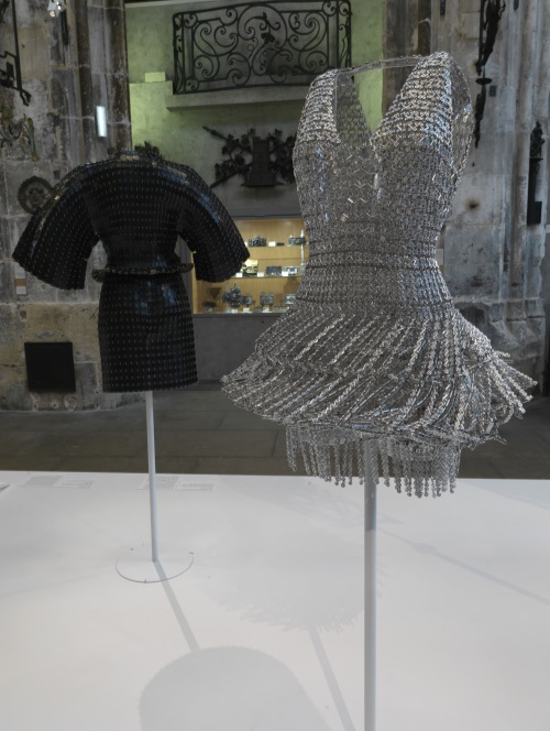 Par ailleurs, les bijoux se sont installés, quant à eux, au Musée de la Céramique. Un précieux bric-à-brac : amulettes de Nouvelle-Guinée, fibules mérovingiennes, bijoux traditionnels normands etc. Châtelaines accessoire-bijou accroché à la ceinture ou parures d’Océanie portés par des guerriers investis de pouvoirs surnaturels. Rue Jacques Villon, le musée Le Secq des Tournelles un des plus beaux de la ville, dédié à la ferronnerie reçoit le roi du métal Paco Rabanne. Vidéos, document, vêtements pour redécouvrir la carrière de celui qui dès les années 60 affirmait : « Une machine à coudre ? C’est un instrument bon pour le musée… J’emploie d’autres instruments qui me permettent d’aller plus vite, comme le marteau, les pinces, les tenailles…